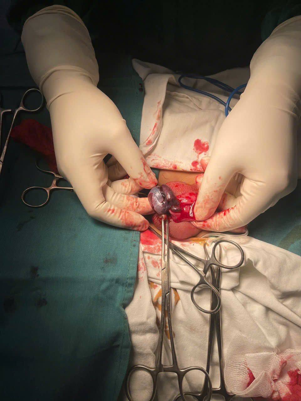 🔸Em H.T. Đ (9 tuổi, trú tại Phường Đa Mai- Tỉnh Bắc Ninh). Theo lời kể của gia đình và bênh nhân,trước khi vào viện khoảng 2 ngày, em đột ngột xuất hiện cơn đau dữ dội vùng bìu bên trái. Ban đầu, em nghĩ chỉ là đau thông thường nên chủ quan không đi khám. Sau một ngày, cơn đau không thuyên giảm, bìu bắt đầu sưng to, nhưng em vẫn e ngại, không nói với gia đình. Đến khi đau dữ dội kèm theo nôn, em mới được đưa vào viện. Các bác sĩ ngay lập tức chẩn đoán: Xoắn tinh hoàn trái và chỉ định mổ cấp cứu, nhưng do tinh hoàn đã tím đen hoại tử không còn khả năng bảo tồn nên phải cắt bỏ để tránh biến chứng nhiễm trùng và ảnh hưởng đến tinh hoàn còn lại.