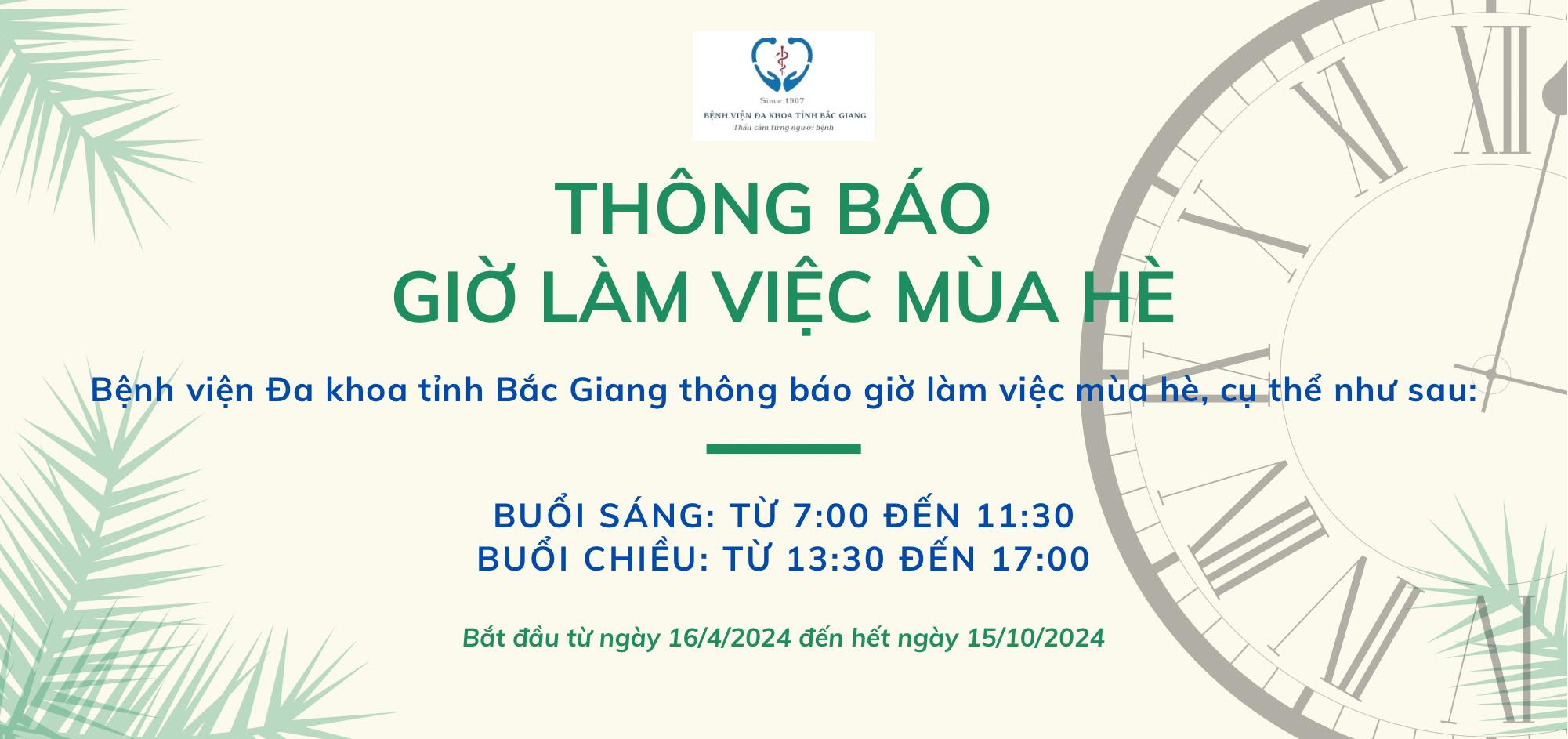 Thứ 5, 11/04/2024 | 00:09 A- A A+ | Thông báo Giờ làm việc mùa hè Đọc bài Lưu Bệnh viện Đa khoa tỉnh Bắc Giang thông báo giờ làm việc mùa hè như sau:Buổi sáng: Từ 7:00 đến 11:30Buổi chiều: Từ 13:30 đến 17:00Bắt đầu từ ngày 16/4/2024 đến hết ngày 15/10/2024.-------------------------- Add: Bệnh viện Đa khoa tỉnh Bắc Giang, Đường Lê Lợi, Phường Hoàng Văn Thụ, Thành phố Bắc Giang, Tỉnh Bắc Giang. Hotline: 1900 0232 Website: Http://bvdktinhbacgiang.vn Email: tiepnhanthongtinbvdkbg@gmail.com Tổng số điểm của bài viết là: 0 trong 0 đánh giá Click để đánh giá bài viết