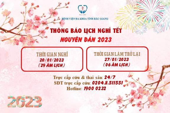 Bệnh viện Đa khoa tỉnh Bắc Giang thông báo lịch nghỉ Tết Nguyên đán năm 2023, như sau: