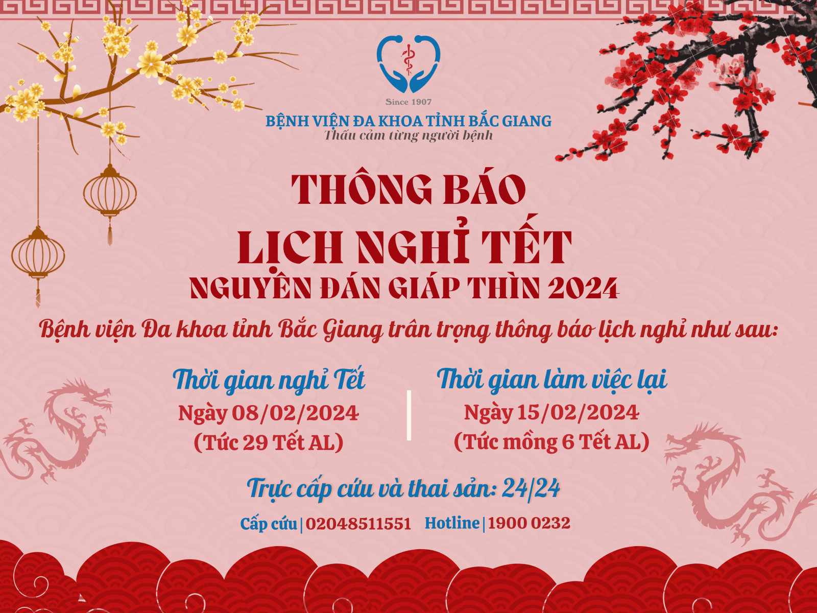 Bệnh viện Đa khoa tỉnh Bắc Giang trân trọng thông báo lịch nghỉ Tết nguyên đán Giáp Thìn năm 2024 như sau: