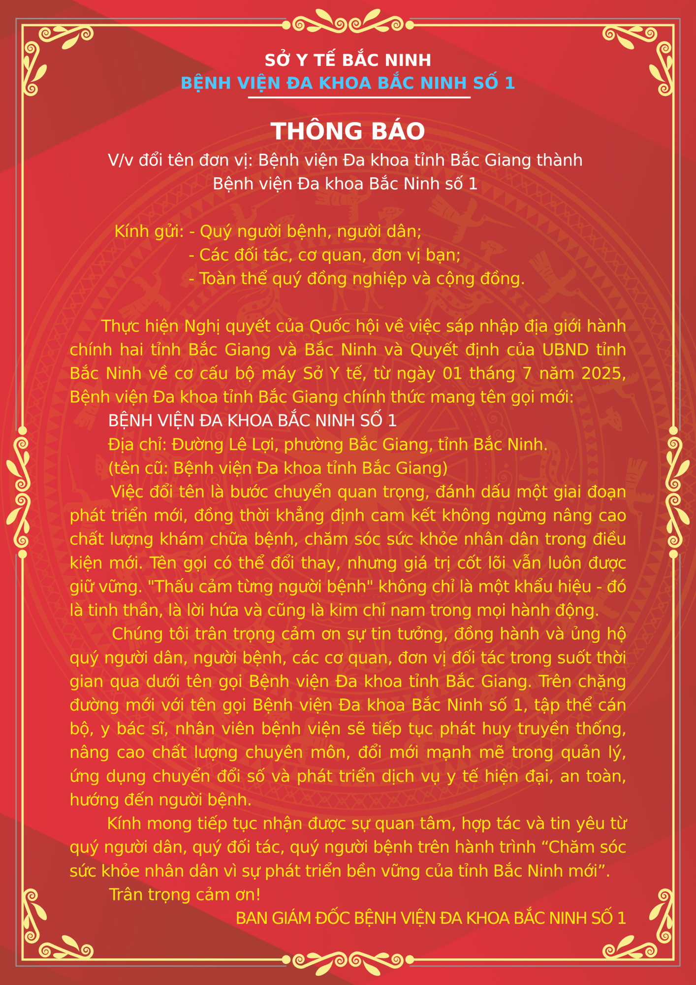 Chúng tôi trân trọng cảm ơn sự tin tưởng, đồng hành và ủng hộ quý người dân, người bệnh, các cơ quan, đơn vị đối tác trong suốt thời gian qua dưới tên gọi Bệnh viện Đa khoa tỉnh Bắc Giang. Trên chặng đường mới với tên gọi Bệnh viện Đa khoa Bắc Ninh số 1, tập thể cán bộ, y bác sĩ, nhân viên bệnh viện sẽ tiếp tục phát huy truyền thống, nâng cao chất lượng chuyên môn, đổi mới mạnh mẽ trong quản lý, ứng dụng chuyển đổi số và phát triển dịch vụ y tế hiện đại, an toàn, hướng đến người bệnh.