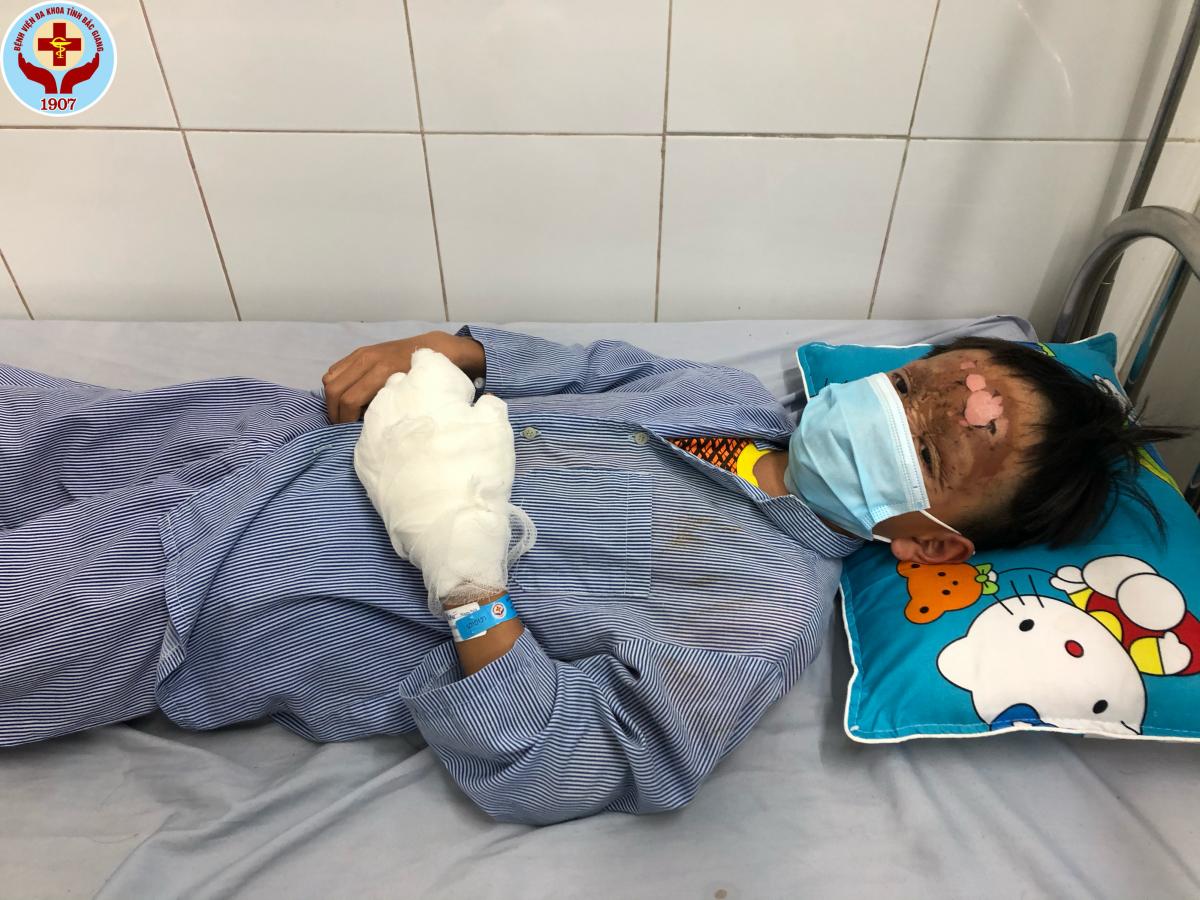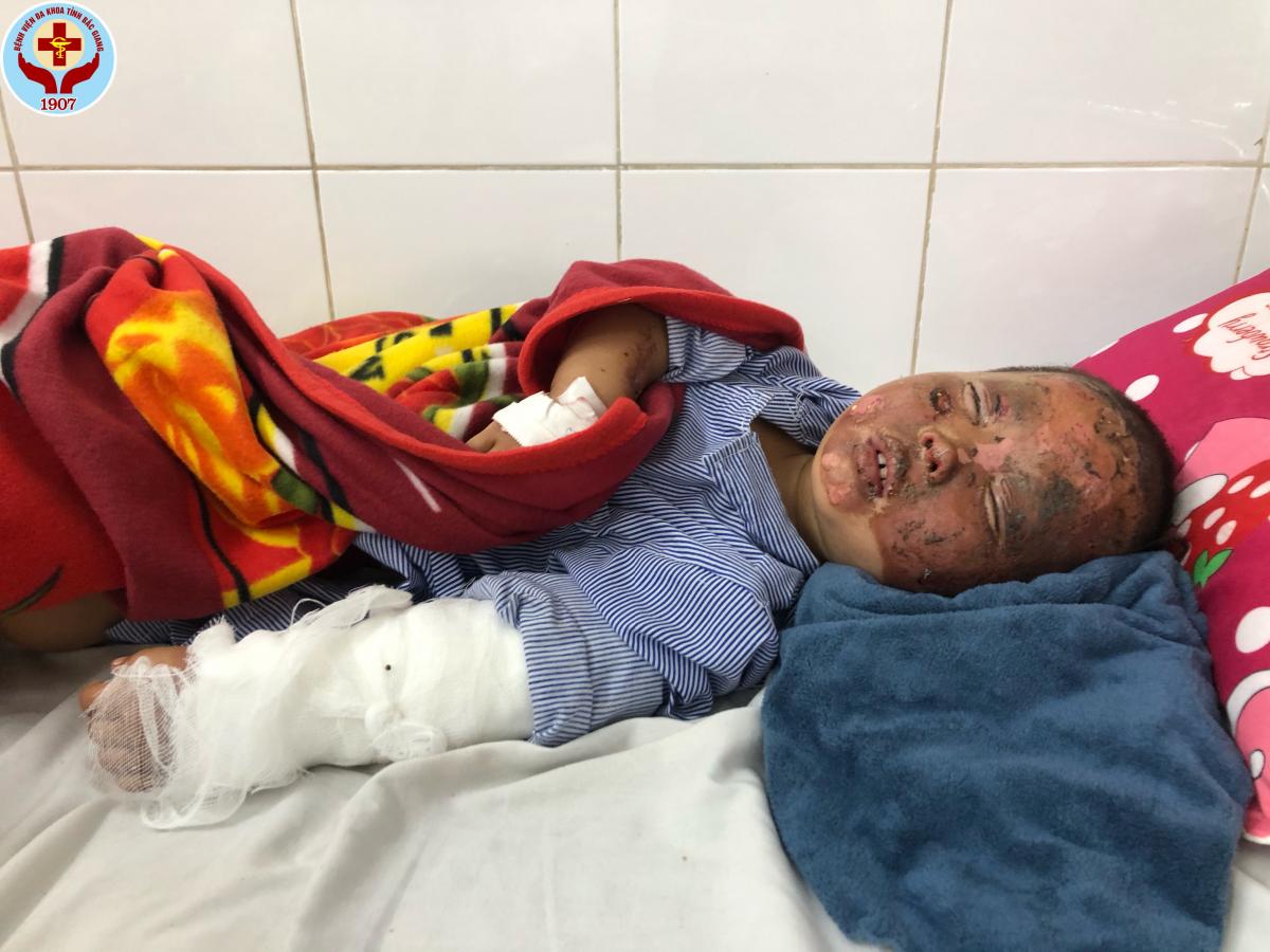 Ngày 6/2/2021, bệnh viện Đa khoa tỉnh Bắc Giang tiếp nhận từ TTYT huyện Lạng Giang bệnh nhi Lương Hải Đ, 3 tuổi trú tại Tân Thanh, Lạng Giang, Bắc Giang. Theo lời kể của bố mẹ, cháu Đ đang chơi ngoài sân thì có vật thể lạ bay vào và bùng cháy. Vật thể lạ đó là do trẻ con hàng xóm cạo đầu que diêm nghịch đốt. Cháu Đ nhập viện trong tình trạng bỏng độ 2,3 vùng mặt, tay và chân. Vết bỏng ở vùng mặt cháy xém, mắt không mở được, những vùng xém da sưng nề nhiều; vết bỏng ở tay chân hoại tử khô có mùi khét lẫn mùi thuốc pháo. Bệnh nhân nhanh chóng được xử lý và chuyển vào khoa điều trị. Sau 3 ngày nằm viện, hiện tại mắt của cháu Đ đã nhìn được tự nhiên, hoại tử đang rụng, dịch tiết vừa.
