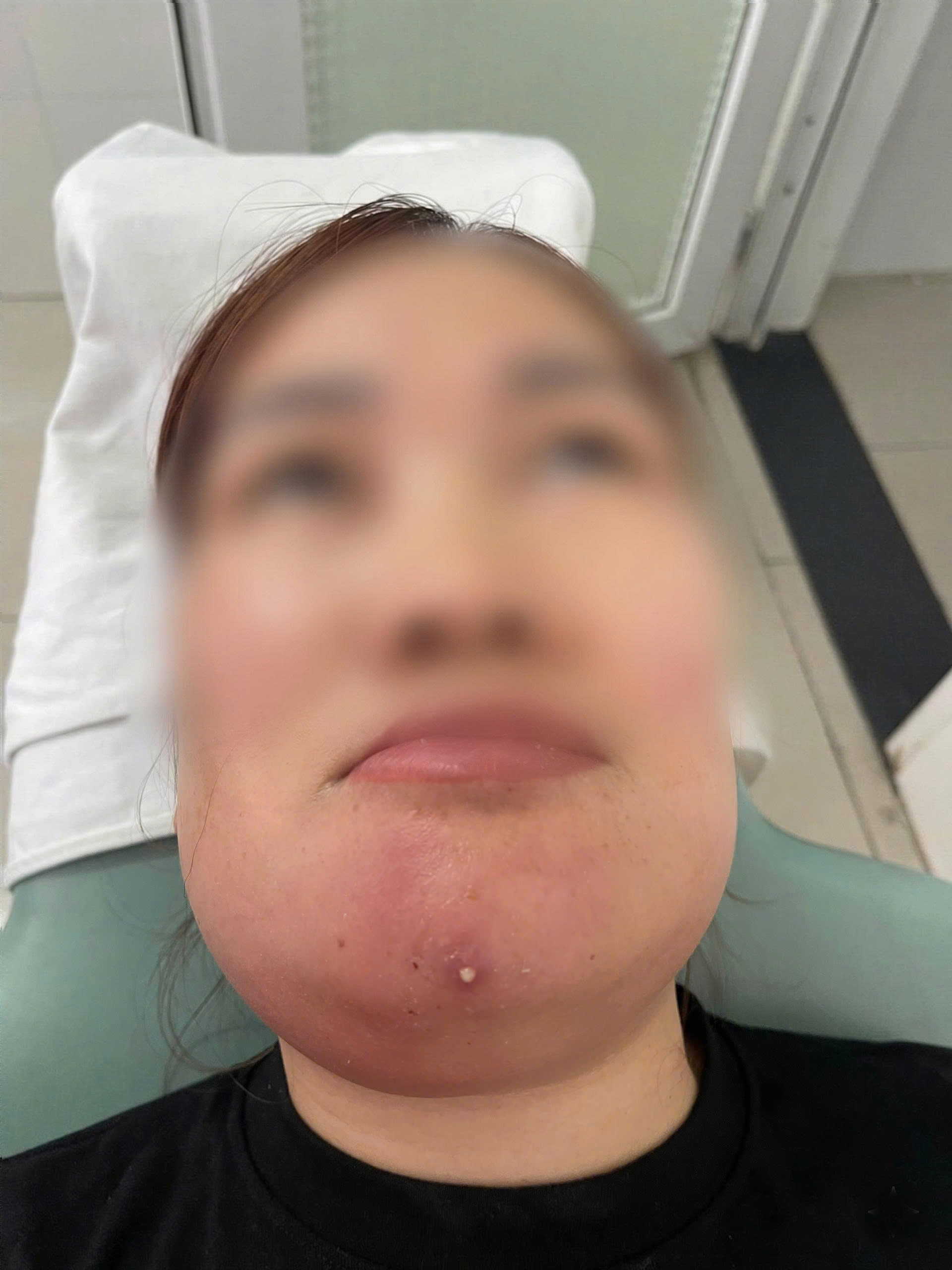 Qua thăm khám, các bác sĩ ghi nhận vùng cằm và dưới hàm hai bên sưng nóng, đỏ, ấn đau, có điểm hóa mủ, ranh giới không rõ. Bệnh nhân được chẩn đoán viêm tấy vùng cằm – dưới hàm hai bên sau nặn mụn ngày thứ 7.