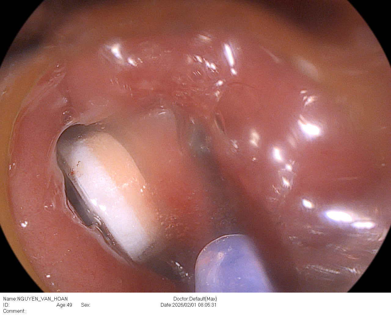Kíp nội soi của Khoa Thăm dò chức năng đã tiến hành gắp dị vật qua nội soi bằng dụng cụ chuyên dụng. Thủ thuật diễn ra thuận lợi, dị vật được lấy ra an toàn. Kiểm tra sau can thiệp ghi nhận niêm mạc thực quản có vết xước nông, không chảy máu, không có dấu hiệu thủng. Các cơ quan khác của ống tiêu hóa như dạ dày, tá tràng ghi nhận hình ảnh niêm mạc cơ bản bình thường.