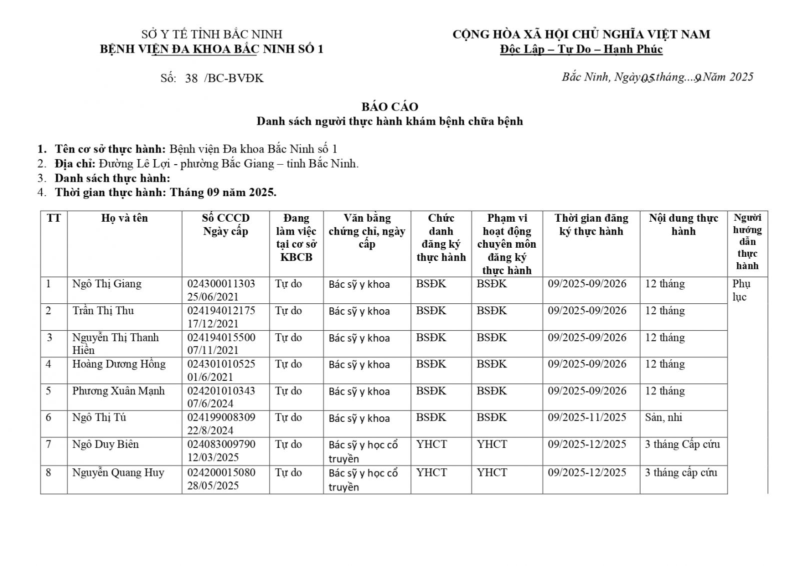 Thứ 6, 05/09/2025 | 15:52 A- A A+ | Báo cáo Danh sách người thực hành khám chữa bệnh Đọc bài Lưu Tổng số điểm của bài viết là: 0 trong 0 đánh giá Click để đánh giá bài viết