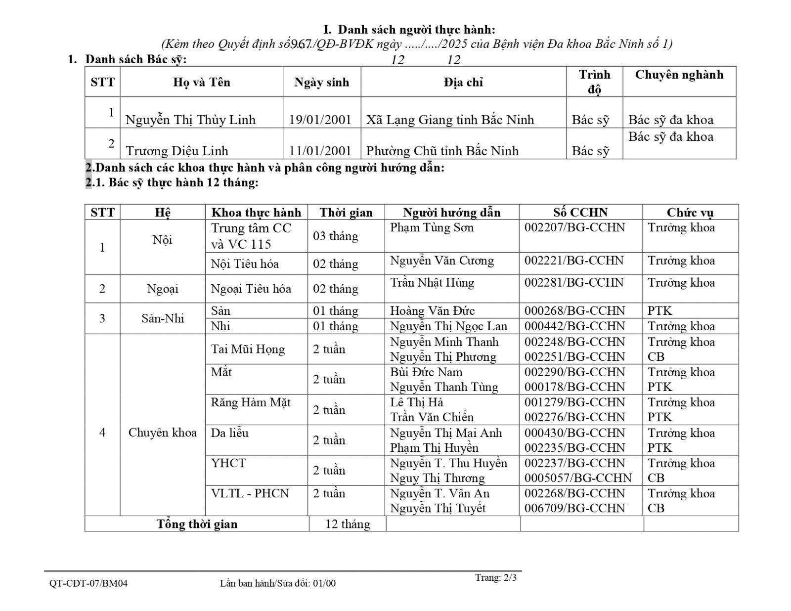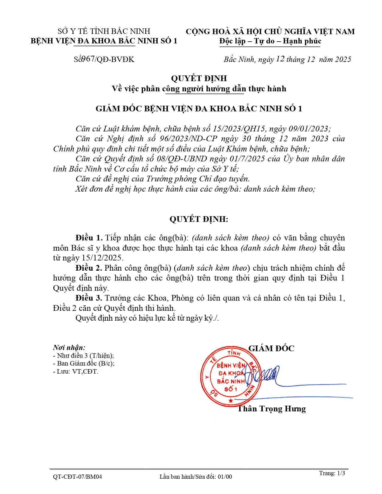 QUYẾT ĐỊNH số 967/QĐ-BVĐK: Về việc phân công người hướng dẫn thực hành