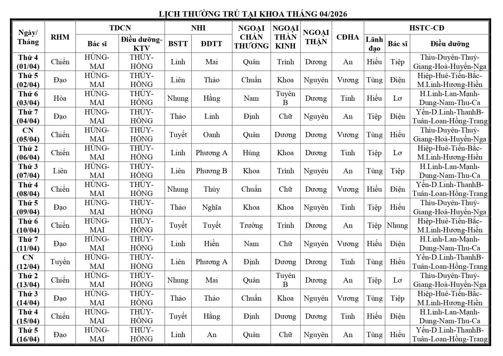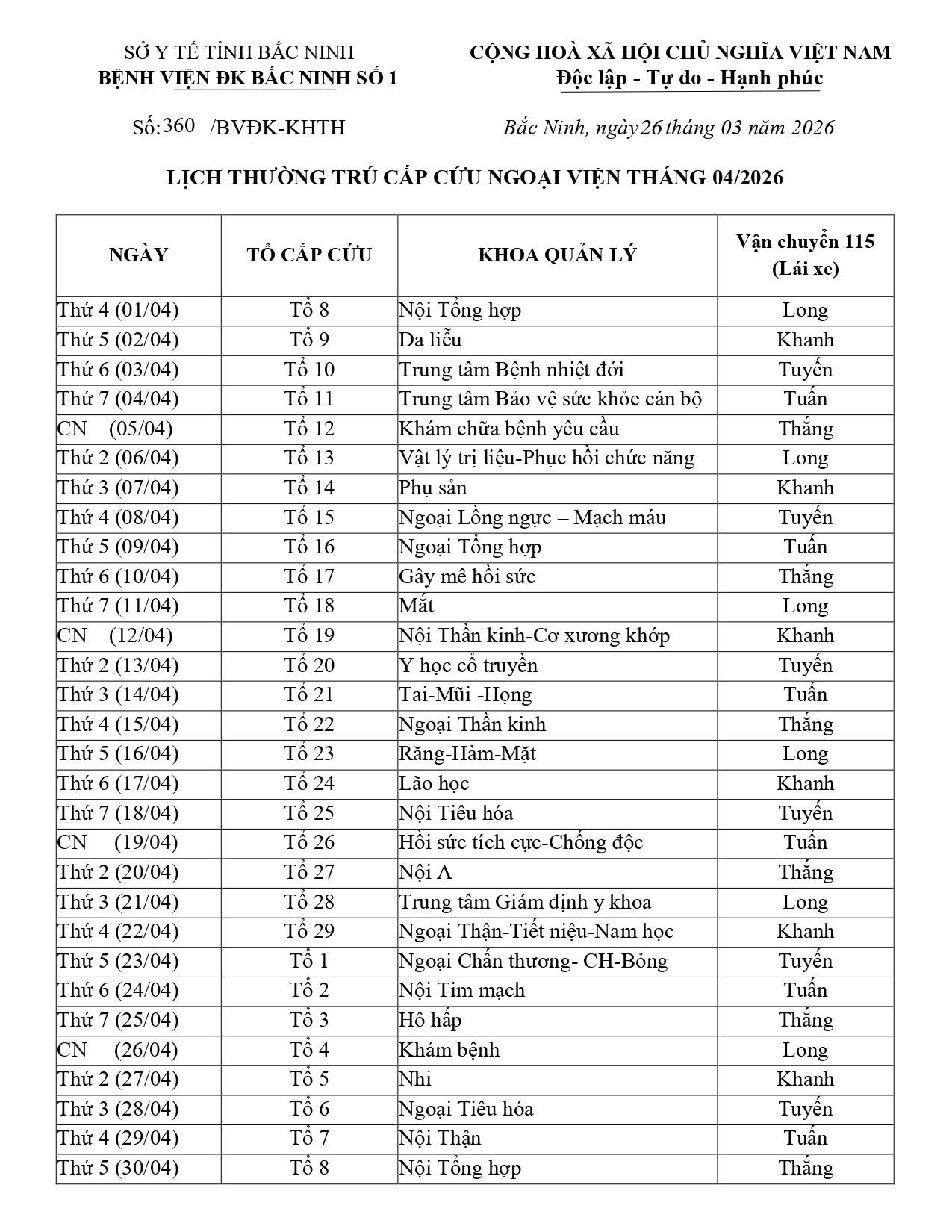 Thứ 6, 27/03/2026 | 09:07 A- A A+ | LỊCH THƯỜNG TRÚ CẤP CỨU NGOẠI VIỆN 115 - THÁNG 4/2026 Đọc bài Lưu Tổng số điểm của bài viết là: 0 trong 0 đánh giá Click để đánh giá bài viết