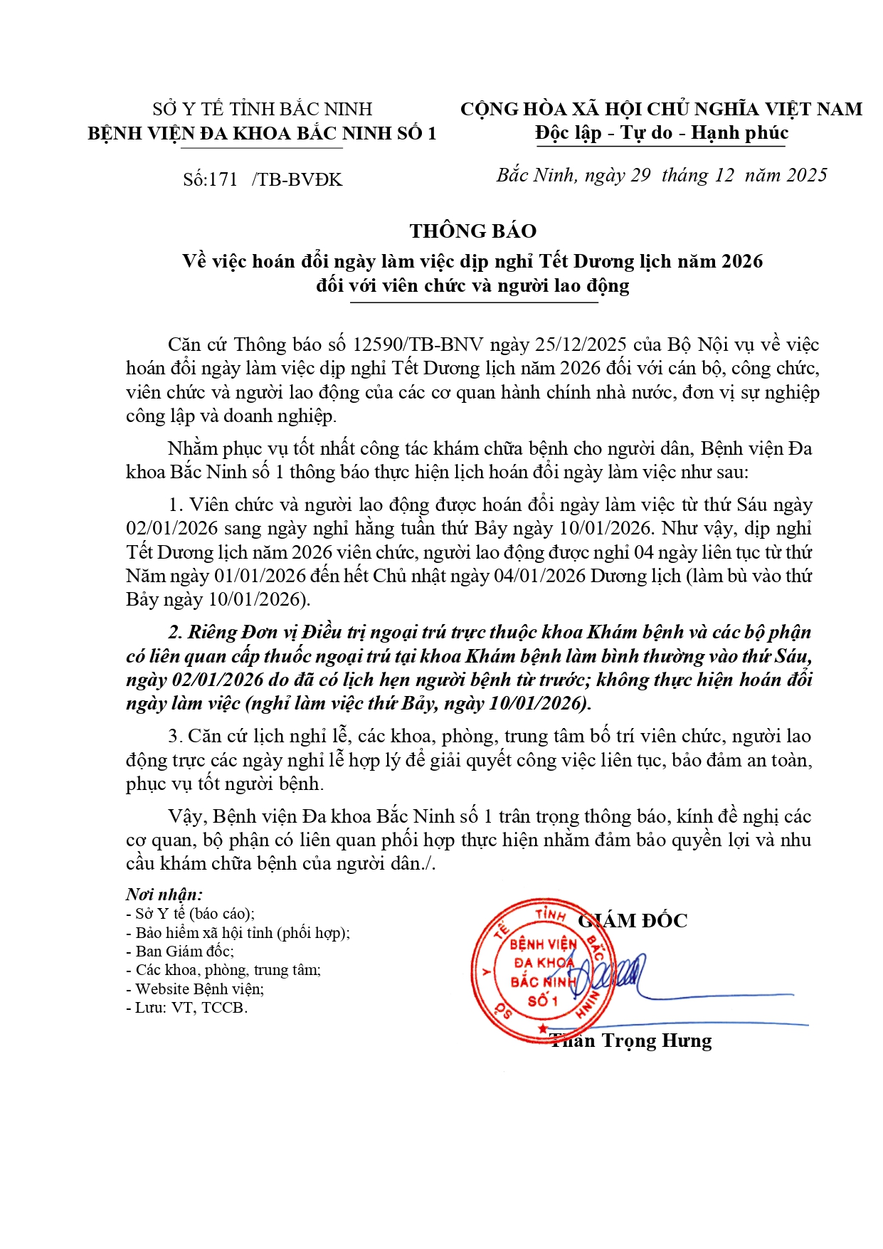 THÔNG BÁO HOÁN ĐỔI NGÀY LÀM VIỆC DỊP NGHỈ TẾT DƯƠNG LỊCH 2026