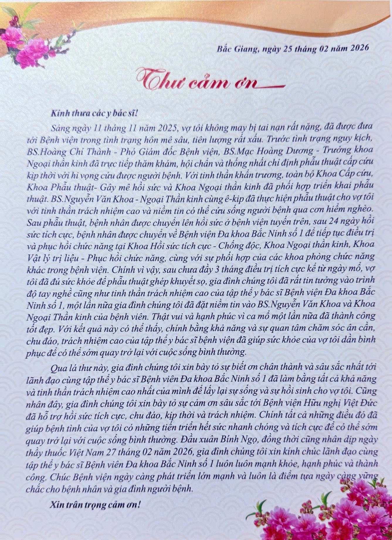 Trong thư, chị H chia sẻ về biến cố lớn xảy ra với bản thân và gia đình khi không may gặp tai nạn nghiêm trọng, nhập viện trong tình trạng hôn mê sâu, tiên lượng rất xấu. Trước tình huống nguy kịch ấy, Ban Giám đốc bệnh viện cùng các bác sĩ chuyên khoa đã trực tiếp thăm khám, hội chẩn khẩn trương và thống nhất chỉ định phẫu thuật cấp cứu – một quyết định mang tính sống còn, đòi hỏi bản lĩnh chuyên môn và tinh thần trách nhiệm rất cao.