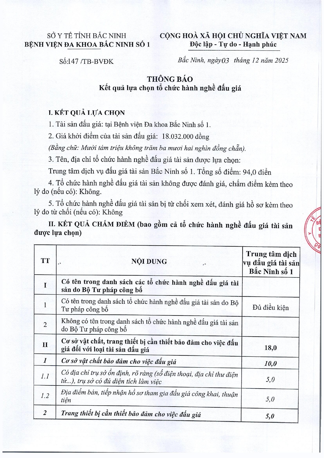 Thứ 4, 03/12/2025 | 14:06 A- A A+ | Thông báo Kết quả lựa chọn tổ chức hành nghề đấu giá (kèm quyết định) Đọc bài Lưu Thông báo: TB 147_0001.pdfQuyết định: QĐ 921_0001.pdf---------------- Tổng số điểm của bài viết là: 0 trong 0 đánh giá Click để đánh giá bài viết