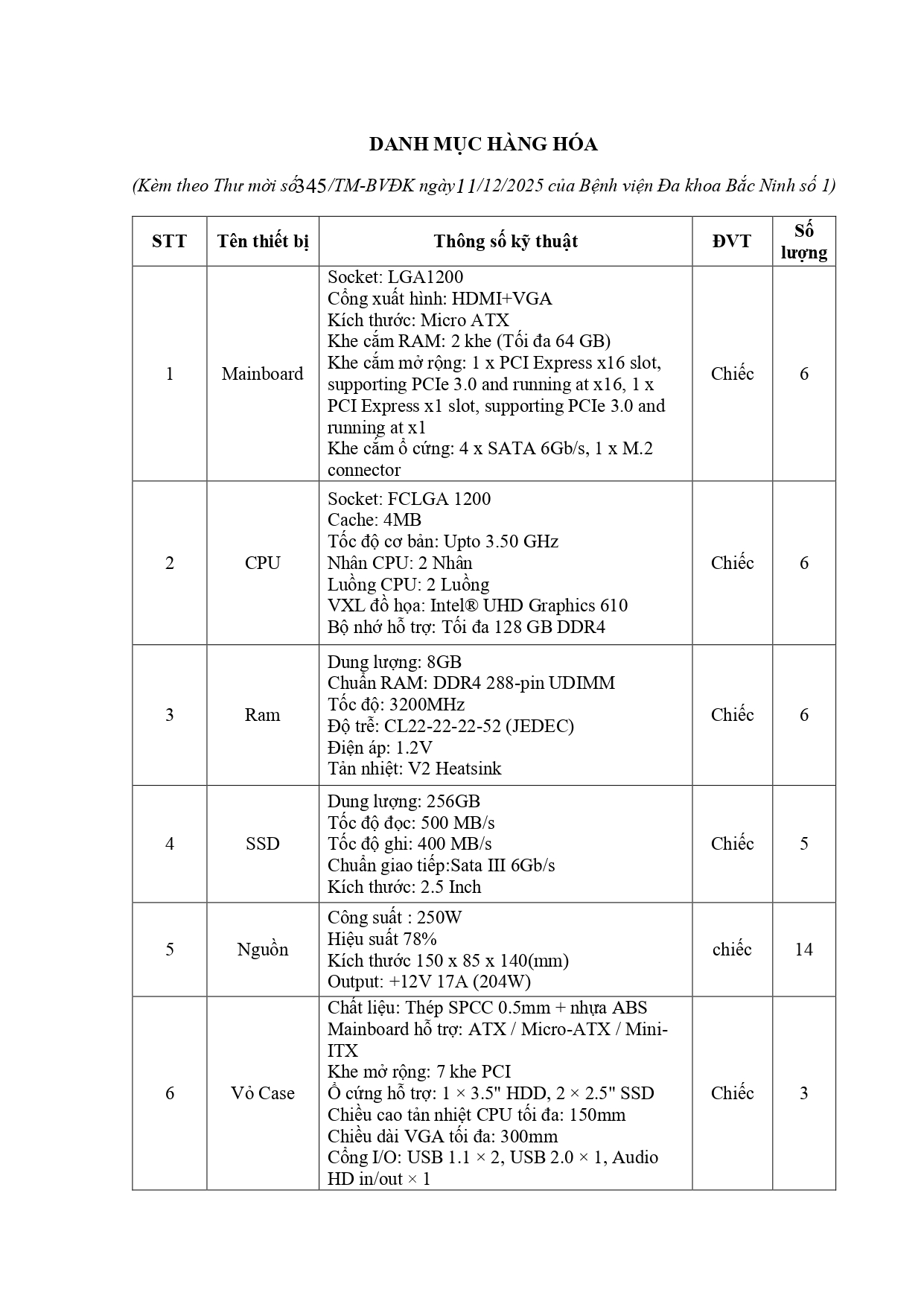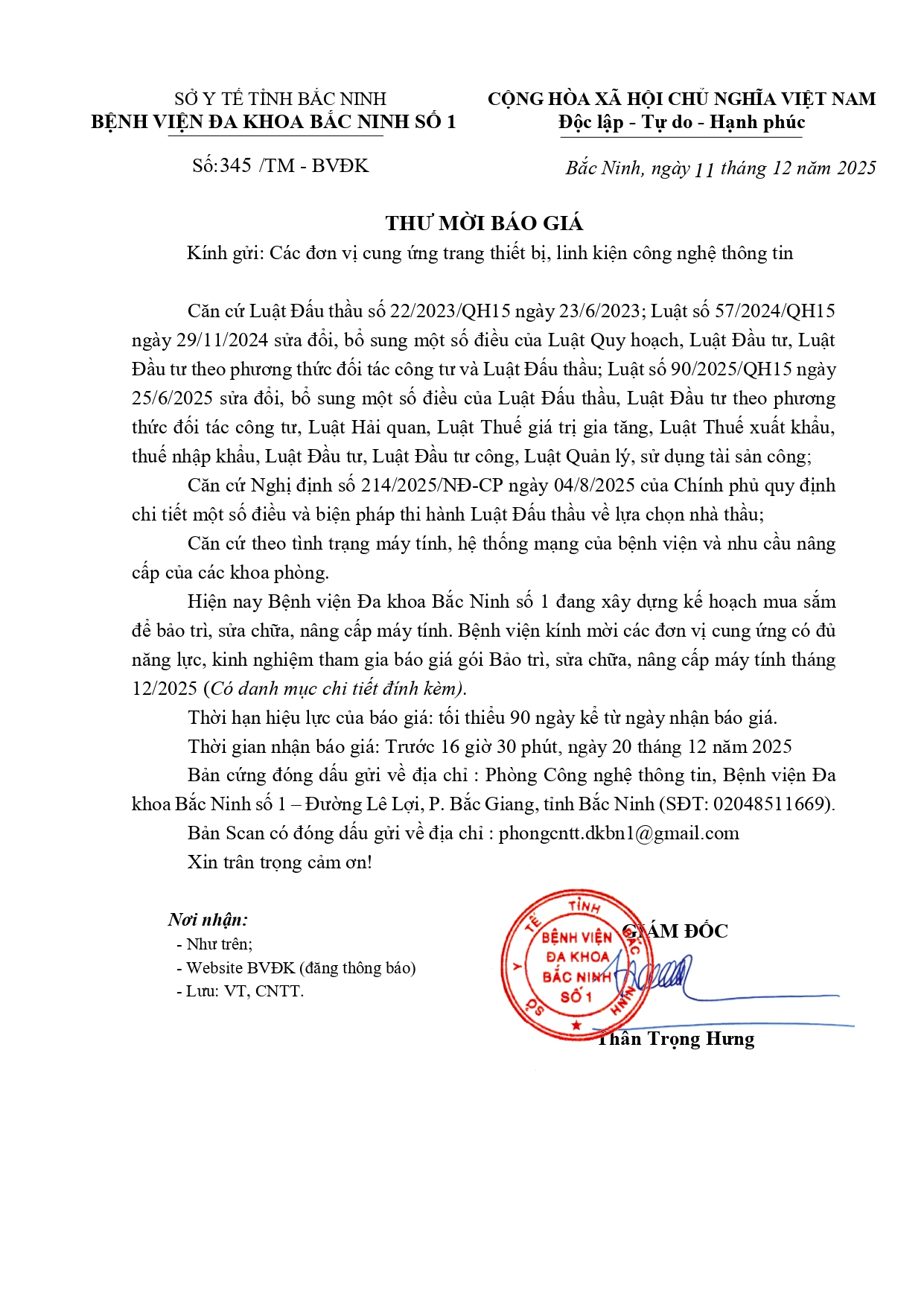 Thứ 5, 11/12/2025 | 15:49 A- A A+ | Thư mời báo giá số 345 Đọc bài Lưu Tổng số điểm của bài viết là: 0 trong 0 đánh giá Click để đánh giá bài viết