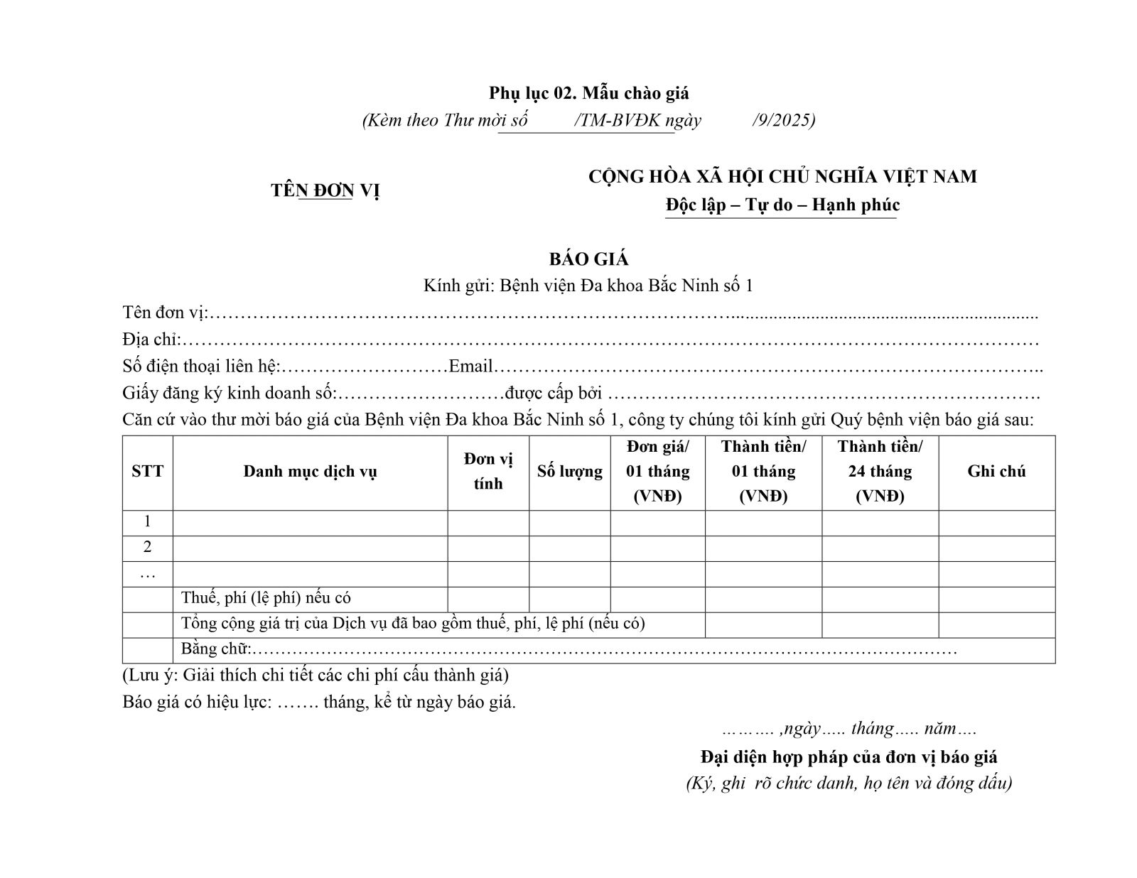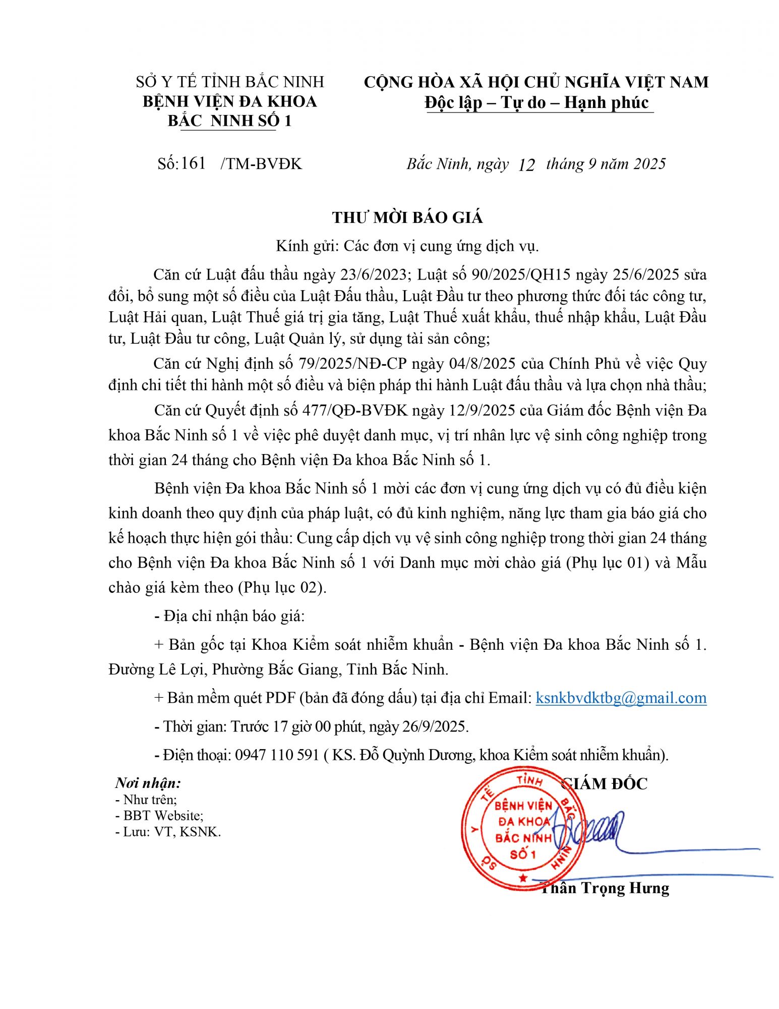Thứ 6, 12/09/2025 | 15:20 A- A A+ | Thư mời chào giá gói thầu: Cung cấp dịch vụ vệ sinh công nghiệp trong thời gian 24 tháng cho Bệnh viện Đa khoa Bắc Ninh số 1 Đọc bài Lưu Link thư mời: TM 161.pdf Tổng số điểm của bài viết là: 0 trong 0 đánh giá Click để đánh giá bài viết