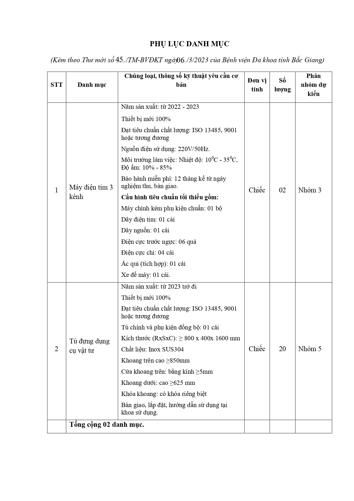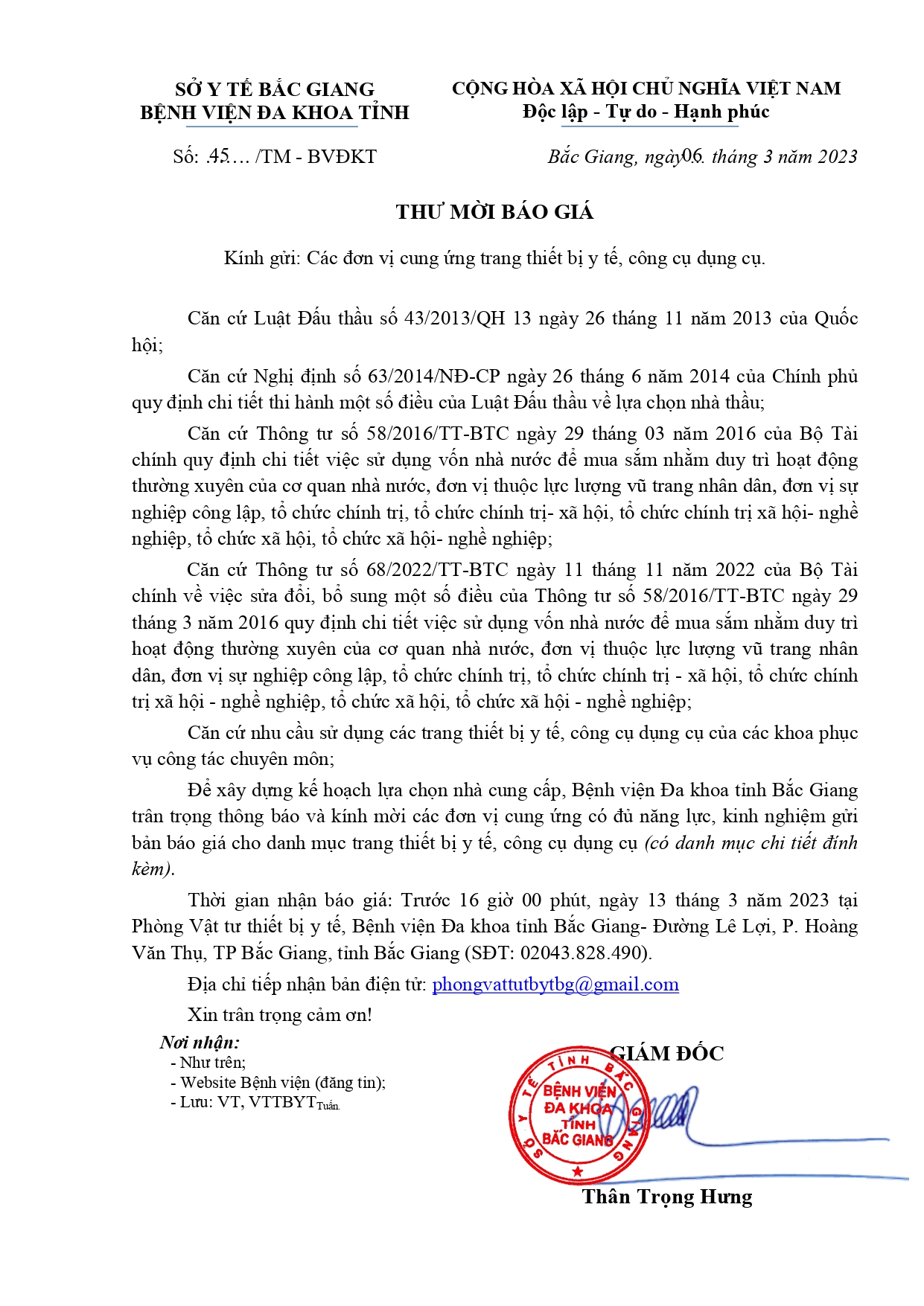 Thư mời báo giá Gói thầu:"Trang thiết bị, công cụ dụng cụ"