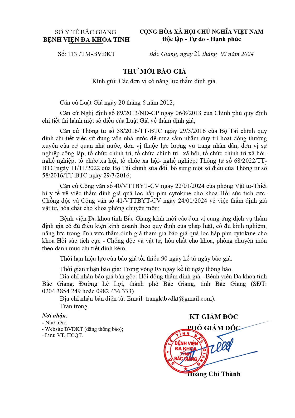 Thư mời báo giá số 113 ngày 21/02/2024 (kèm file danh mục)
