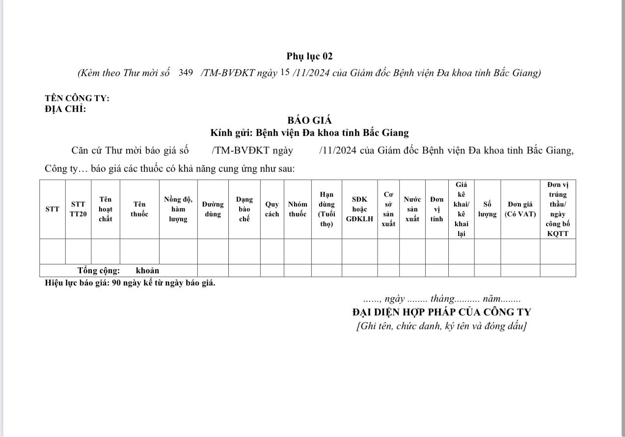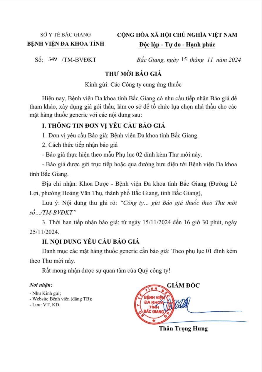 Thứ 6, 15/11/2024 | 20:30 A- A A+ | Thư mời báo giá số 349 Đọc bài Lưu Tổng số điểm của bài viết là: 0 trong 0 đánh giá Click để đánh giá bài viết