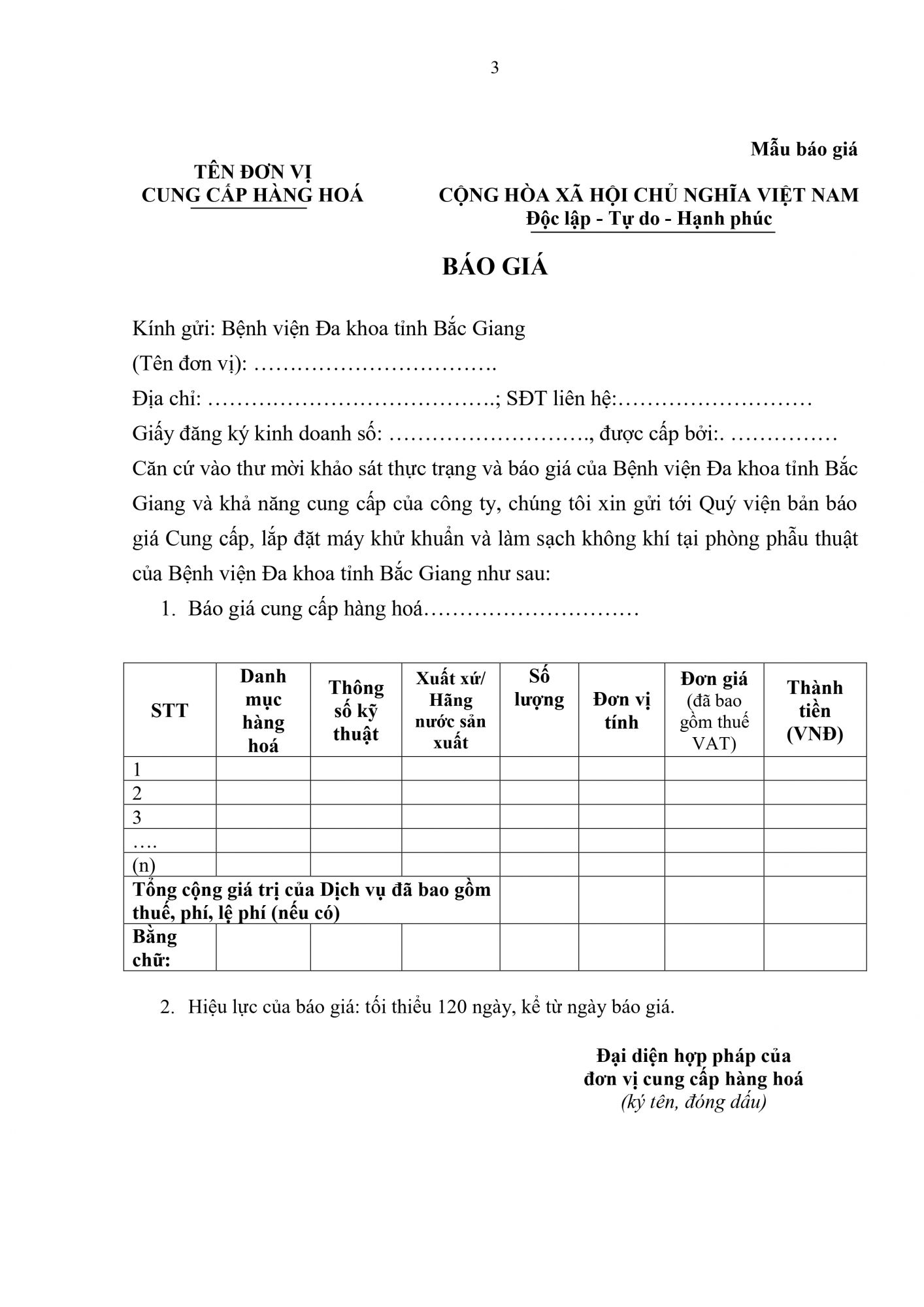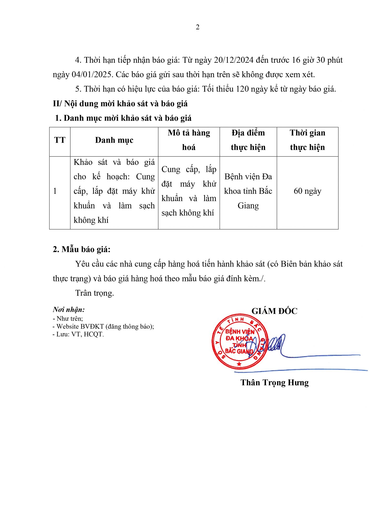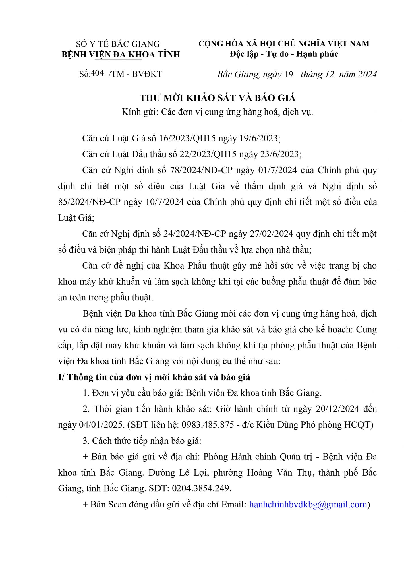Thứ 5, 19/12/2024 | 09:10 A- A A+ | Thư mời báo giá số 404 Đọc bài Lưu Link File mời báo giá: 1. Thư mời KS&BG Máy khử khuẩn 12.24_signed_signed_signed_signed.pdf Tổng số điểm của bài viết là: 0 trong 0 đánh giá Click để đánh giá bài viết