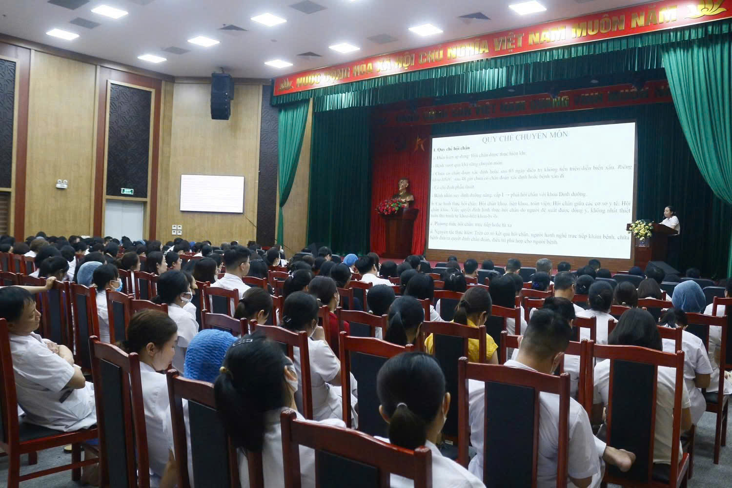 Tại Hội nghị, Bs. Nguyễn Thị Vang, TP. Kế hoạch tổng hợp đã truyền đạt, quán triệt, phổ biến một số nội dung liên quan đến Quy chế chuyên môn; quy trình kỹ thuật. Đại diện phòng Kế hoạch tổng hợp cũng nhấn mạnh: nhân viên y tế thực hiện tốt quy chế hội chẩn, quy chế trực, ưu tiên nguồn lực tốt nhất cho các đơn vị tập trung cao cứu sống người bệnh. Ngoài ra việc tuân thủ các hướng dẫn, phạm vi chuyên môn, danh mục và quy trình kỹ thuật, ghi chép trung thực, bảo mật tuyệt đối cũng là sợi dây để thắt chặt sự an toàn của người bệnh cũng như NVYT.
