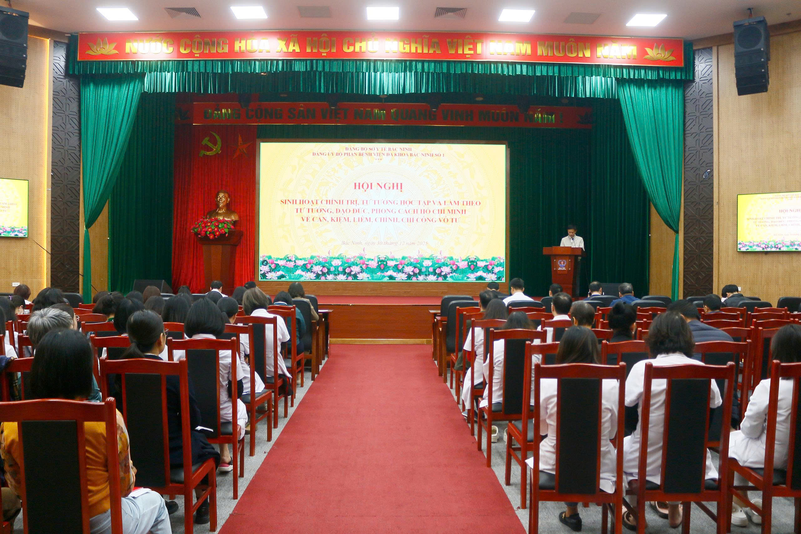 Thực hiện Kế hoạch số 08-KH/ĐU ngày 08/4/2025 của Đảng ủy Bệnh viện Đa khoa tỉnh Bắc Giang (nay là Đảng ủy bộ phận Bệnh viện Đa khoa Bắc Ninh số 1) về tổ chức sinh hoạt chính trị, tư tưởng về nội dung về các chủ trương, định hướng lớn của Đảng và nội dung chỉ đạo trong các bài viết, bài phát biểu của đồng chí Tổng Bí thư Tô Lâm. Chiều 30/12/2025, Đảng ủy bộ phận Bệnh viện Đa khoa Bắc Ninh số 1 tổ chức Hội nghị triển khai nhiệm vụ công tác trọng tâm năm 2026 gắn với sinh hoạt chính trị, tư tưởng quý IV năm 2025. Hội nghị được tổ chức trực tiếp tại Hội trường và tại 25 điểm cầu các chi bộ trực thuộc với tổng số 407 đảng viên tham gia. Báo cáo viên Nguyễn Văn Nguyên- Giảng viên khoa Tư tưởng Hồ Chí Minh, Trường chính trị Nguyễn Văn Cừ Bắc Ninh trực tiếp truyền đạt nội dung báo cáo chuyên đề.
