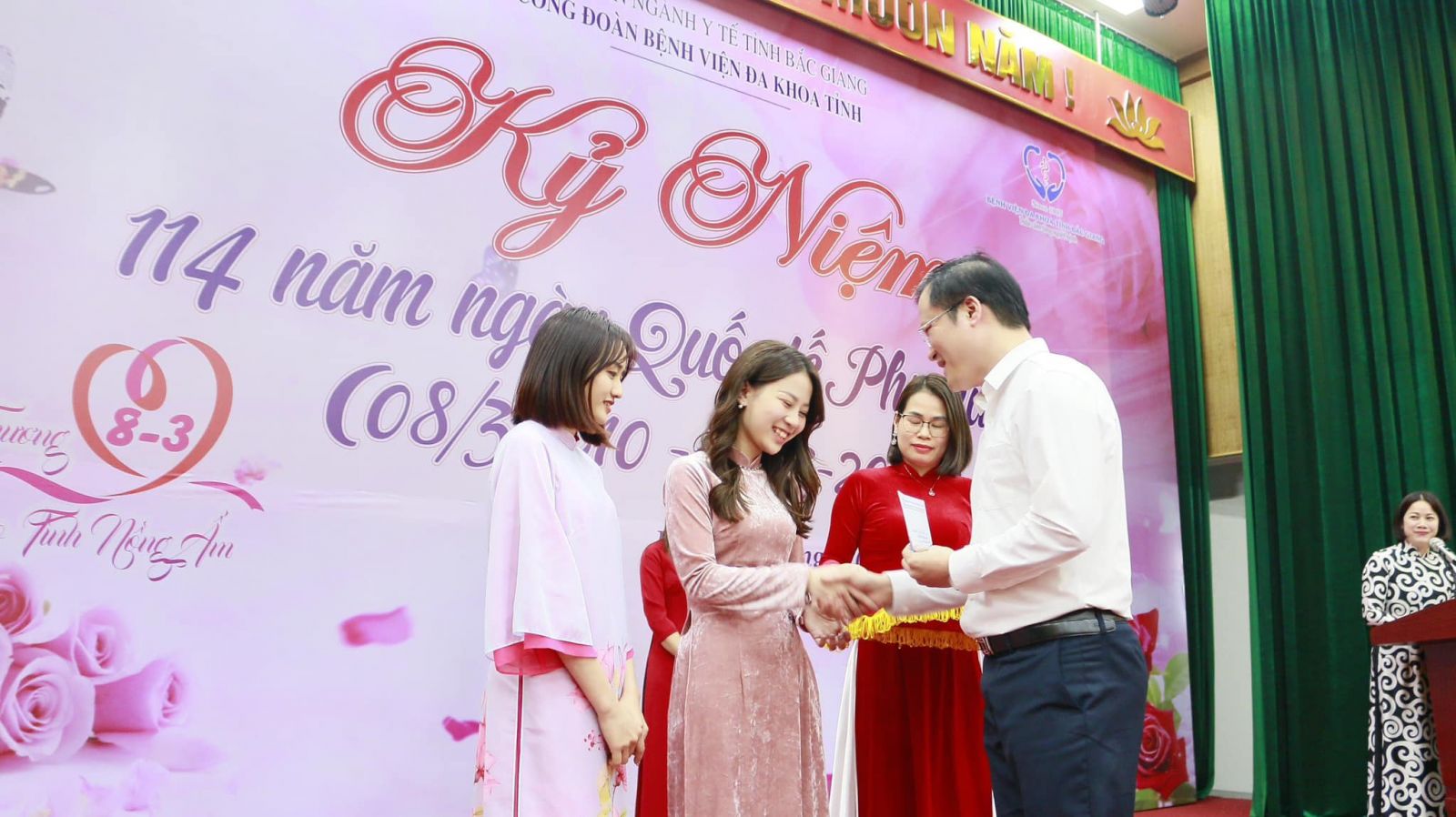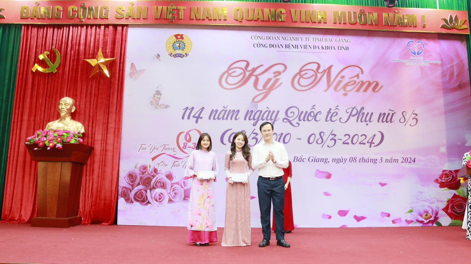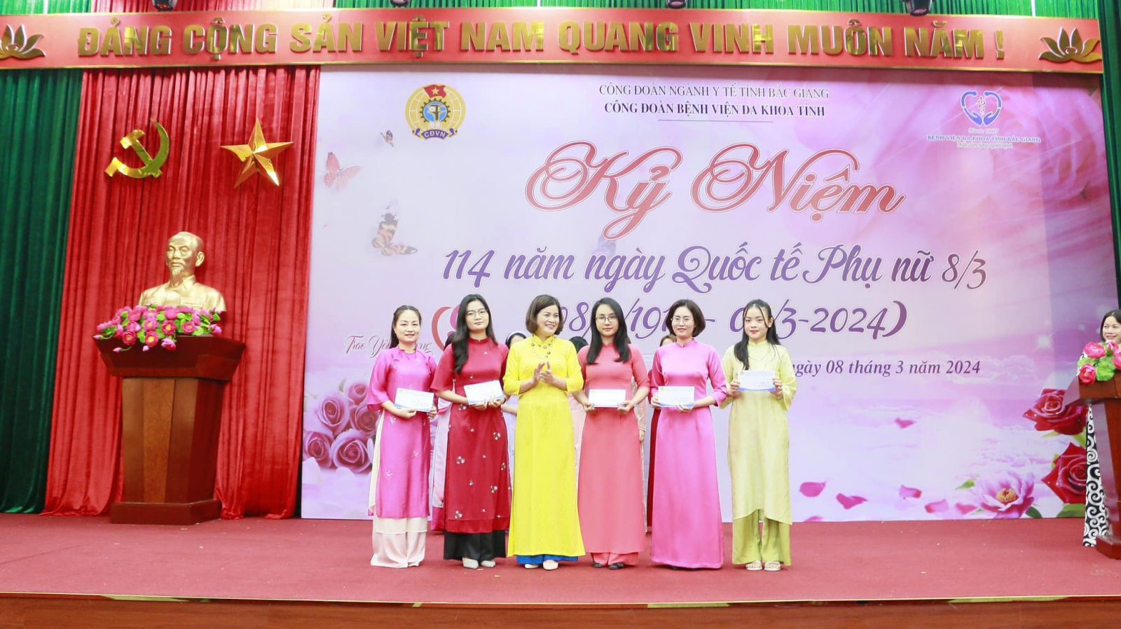 Bên cạnh đó, đại diện Ban chấp hành Công đoàn đã công bố và trao giải cuộc thi ảnh "Duyên dáng áo dài" nữ đoàn viên, người lao động Bệnh viện Đa khoa tỉnh Bắc Giang năm 2024". Qua đó đã trao 01 giải nhất, 02 giải nhì, 02 giải ba và 05 giải khuyến khích cho các cá nhân xuất sắc là nhân vật chính của những bức ảnh duyên dáng, xinh tươi, thể hiện tinh thần của người phụ nữ Việt Nam thời đại mới trong tà áo dài truyền thống của dân tộc "Giỏi việc nước, đảm việc nhà".