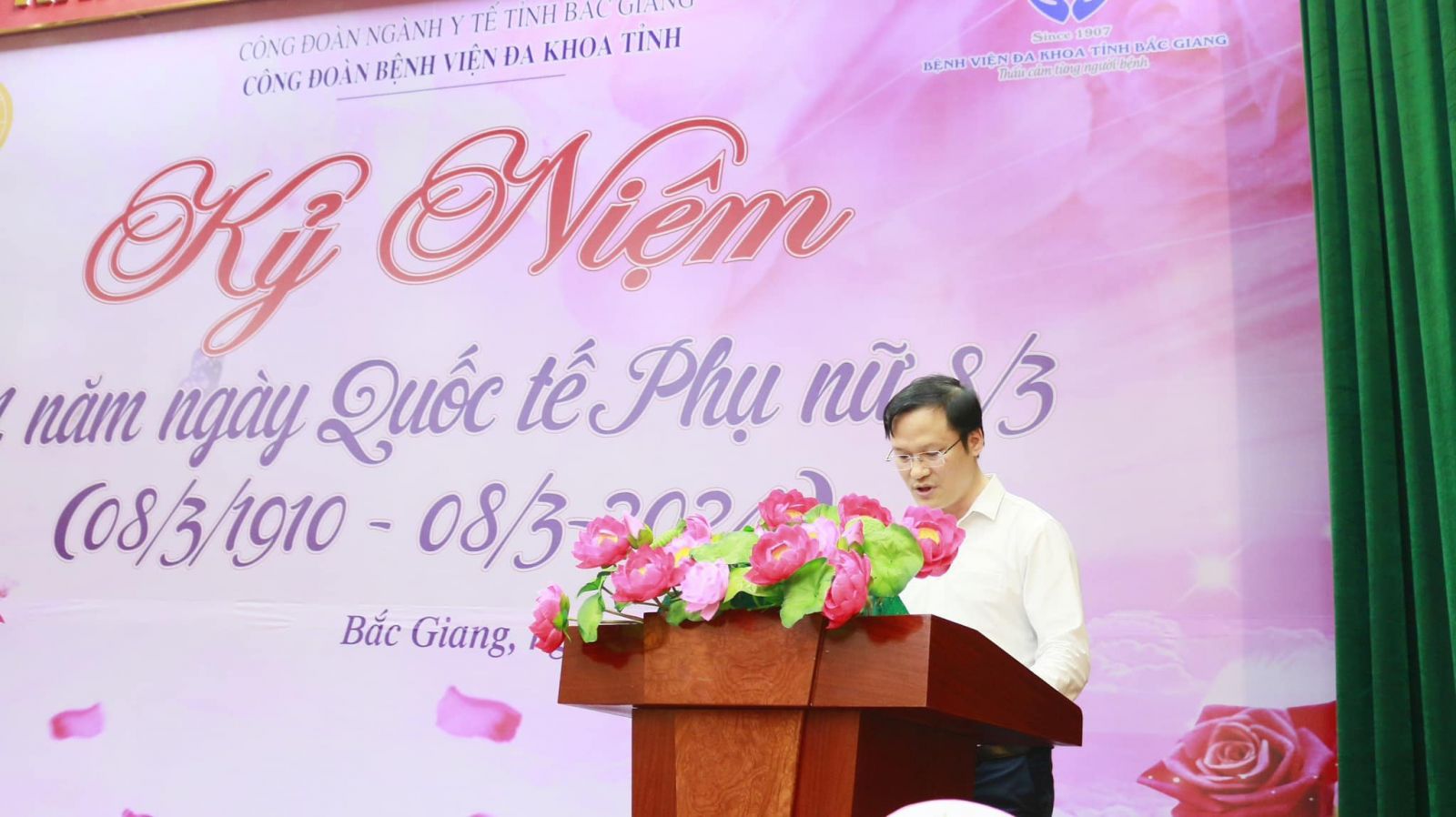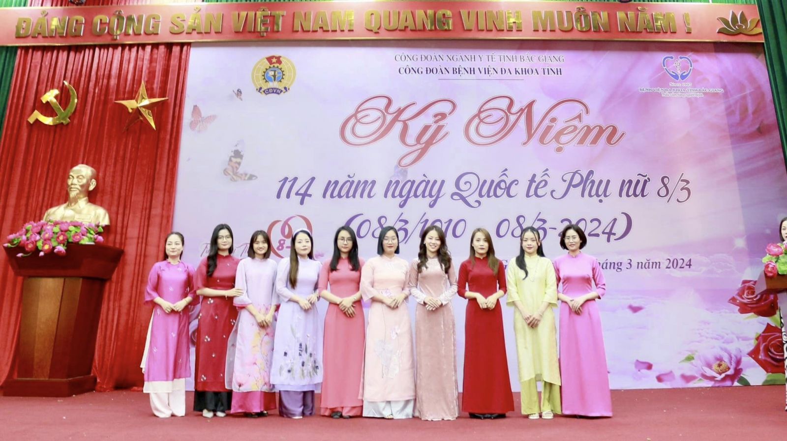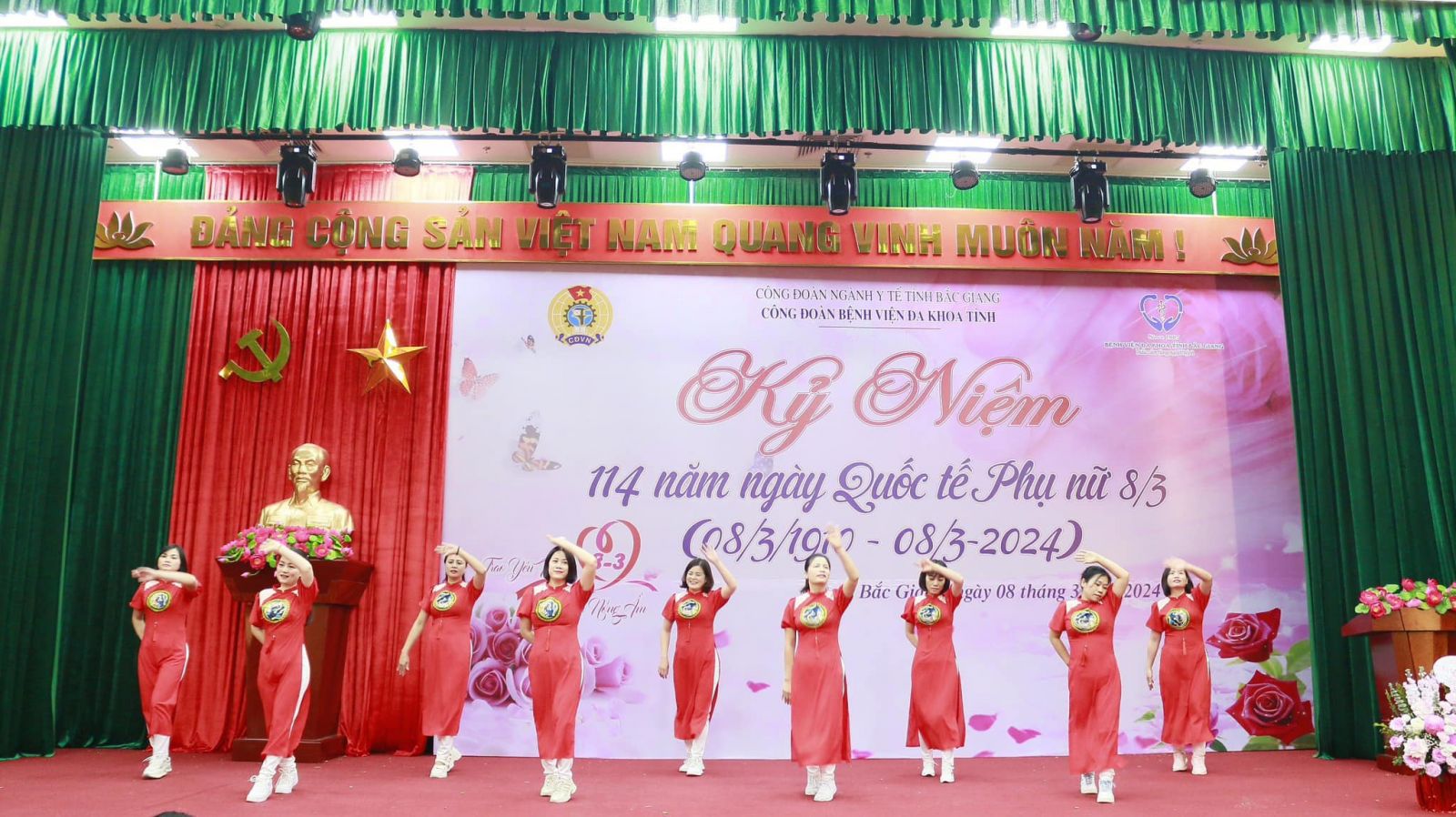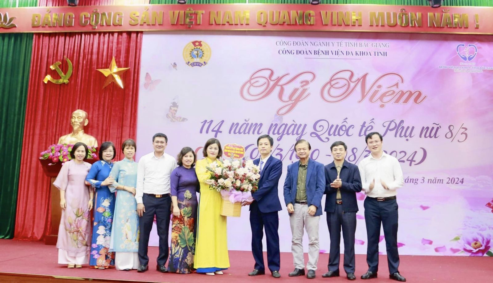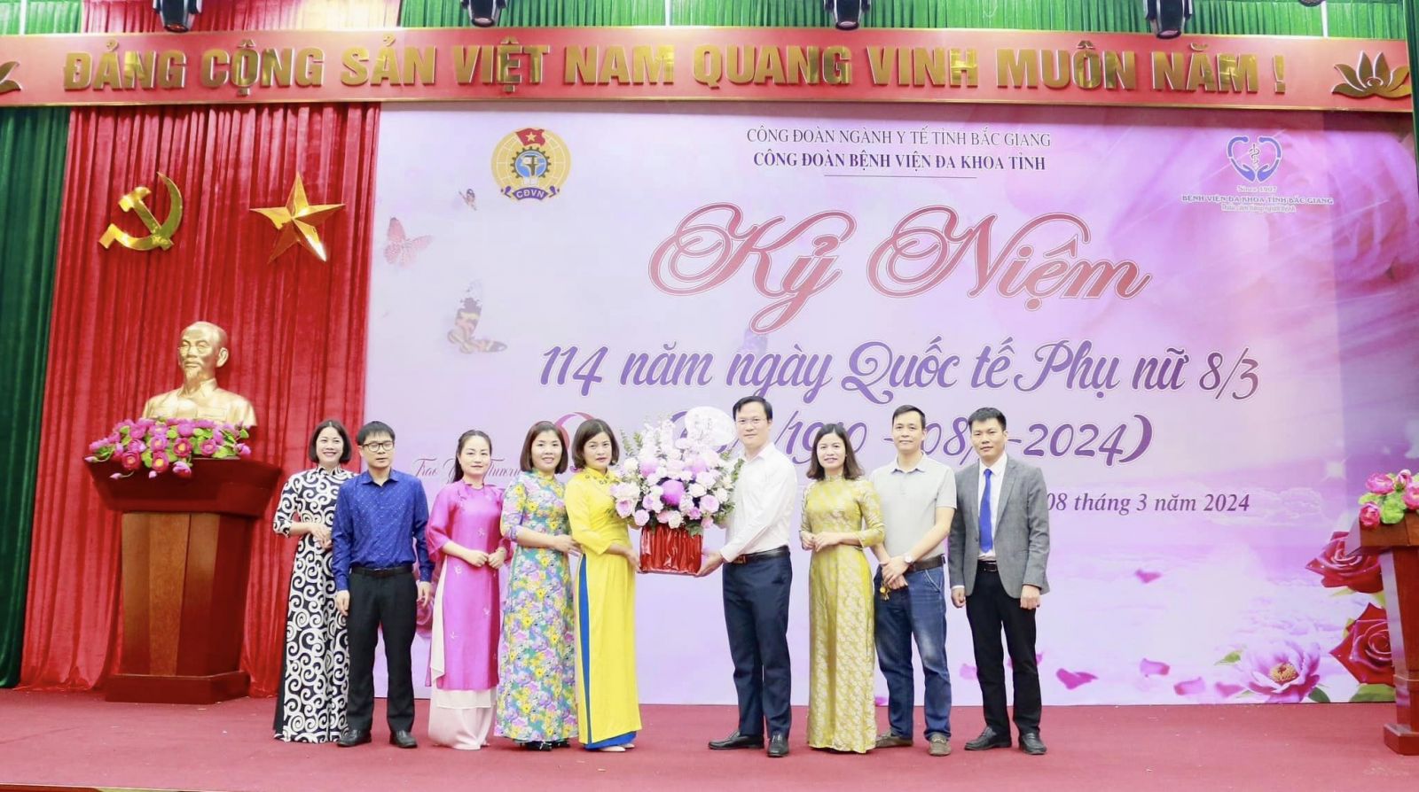 Chiều ngày 08/3/2024, tại Hội trường, nhà G, Bệnh viện Đa khoa tỉnh Bắc Giang long trọng tổ chức Lễ Mít tinh kỷ niệm 114 năm ngày Quốc tế Phụ nữ (08/3/1910 - 8/3/2024) và 1984 năm khởi nghĩa hai Bà Trưng. Tham dự buổi Lễ có đông đảo đoàn viên phụ nữ đến từ 50 tổ công đoàn trực thuộc Bệnh viện.