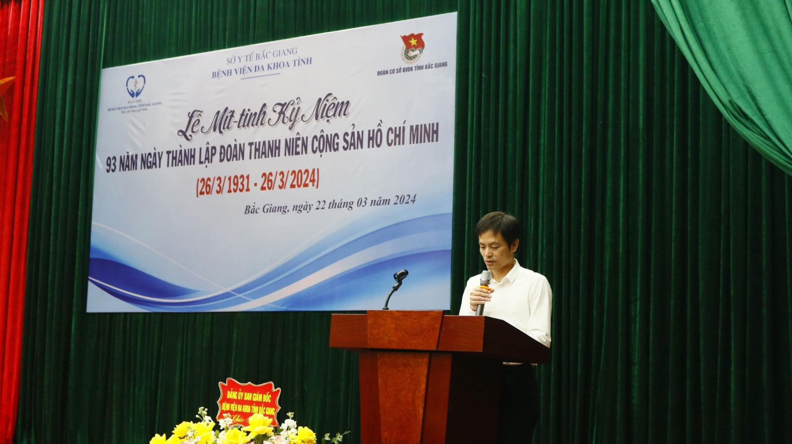 Chiều 22/3, tại Hội trường nhà G, Đoàn cơ sở Bệnh viện Đa khoa tỉnh Bắc Giang long trọng tổ chức Lễ mít - tinh kỷ niệm 93 năm ngày thành lập Đoàn Thanh niên cộng sản Hồ Chí Minh ( 26/3/1931-26/3/2024).