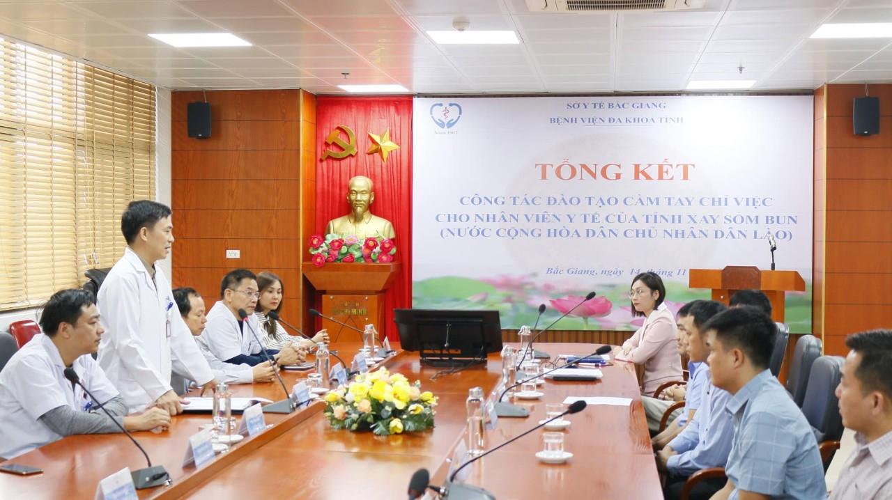 Ngày 14/11/2023, Bệnh viện Đa khoa tỉnh Bắc Giang tổ chức gặp mặt, tổng kết công tác đào tạo, chuyển giao kỹ thuật theo hình thức cầm tay chỉ việc cho nhân viên y tế tại tỉnh Xay Sổm Bun (Lào) sang đào tạo tại tỉnh Bắc Giang. Dự buổi gặp mặt có đại diện Lãnh đạo Bệnh viện, trưởng các khoa có cán bộ tham gia học tập và 02 bác sĩ, y sĩ đến từ tỉnh Xay Sổm Bun (Lào).
