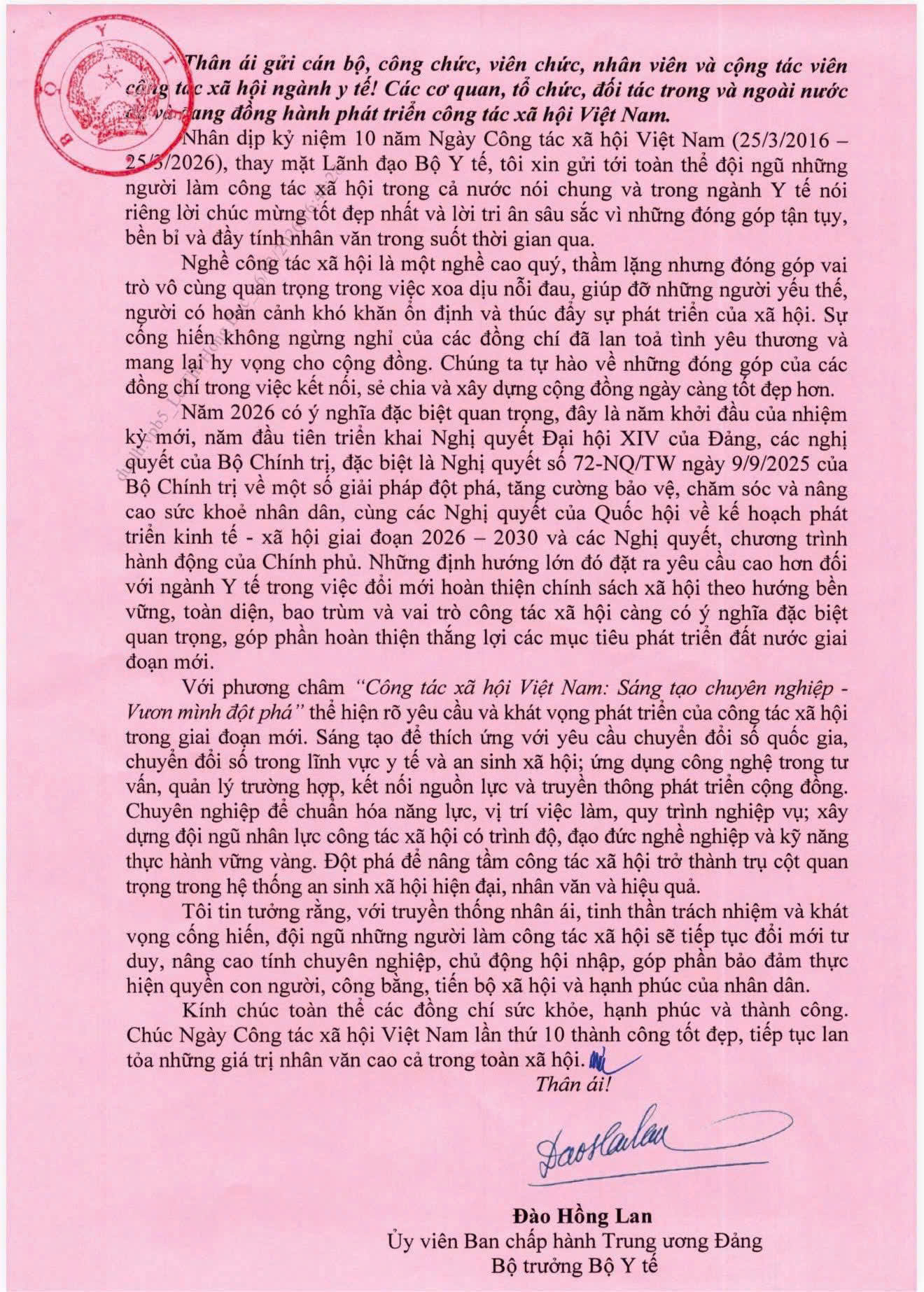 💐 Nhân kỷ niệm 10 năm Ngày Công tác xã hội Việt Nam, Ủy viên Trung ương Đảng, Bộ trưởng Bộ Y tế Đào Hồng Lan đã gửi thư chúc mừng tới toàn thể cán bộ, công chức, viên chức, nhân viên và cộng tác viên công tác xã hội trên cả nước; cùng các cơ quan, tổ chức, đối tác đồng hành phát triển công tác xã hội Việt Nam.