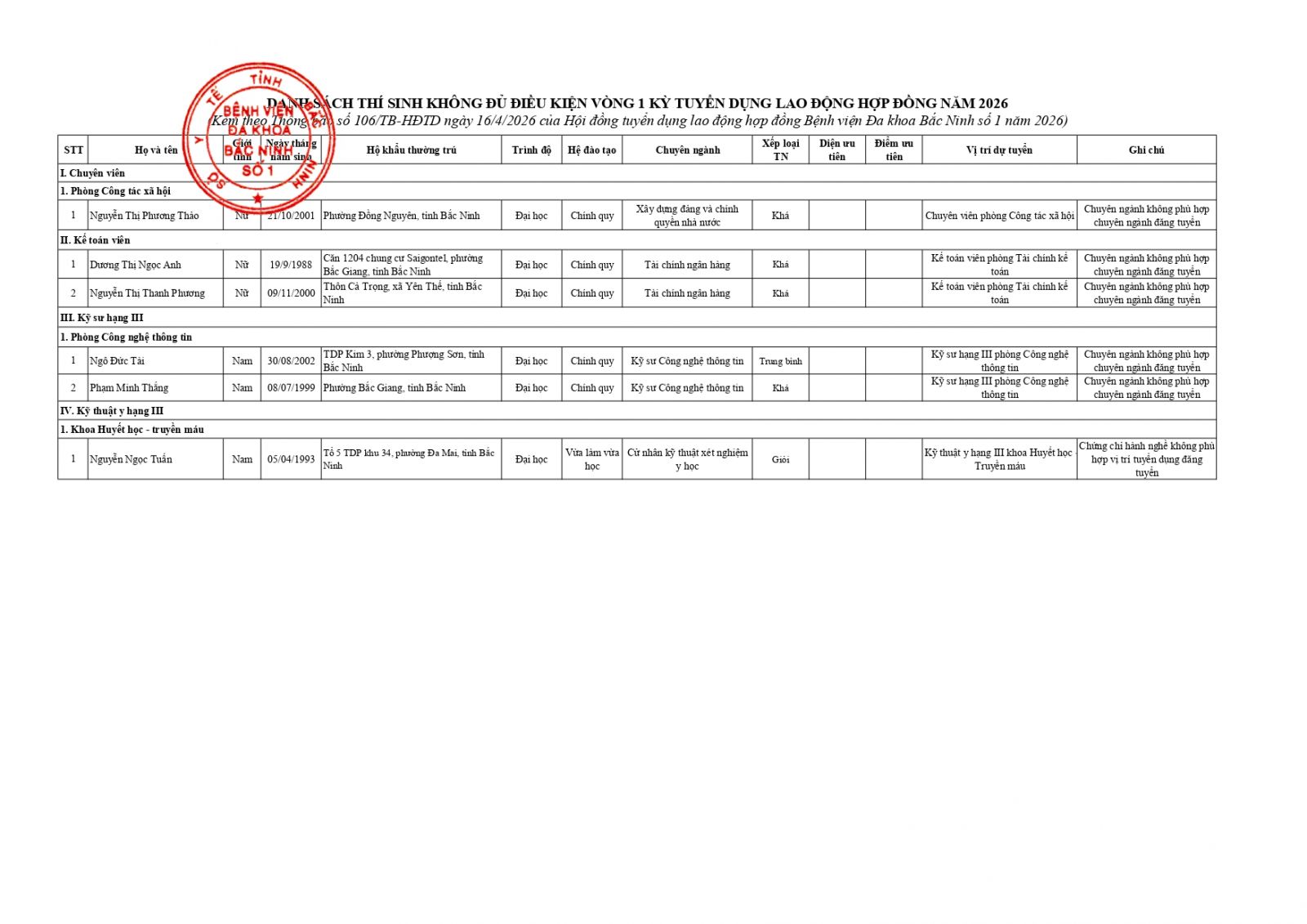 Bệnh viện Đa khoa Bắc Ninh số 1 thông báo danh sách thí sinh không đủ điều kiện vòng 1 tuyển dụng hợp đồng lao động năm 2026