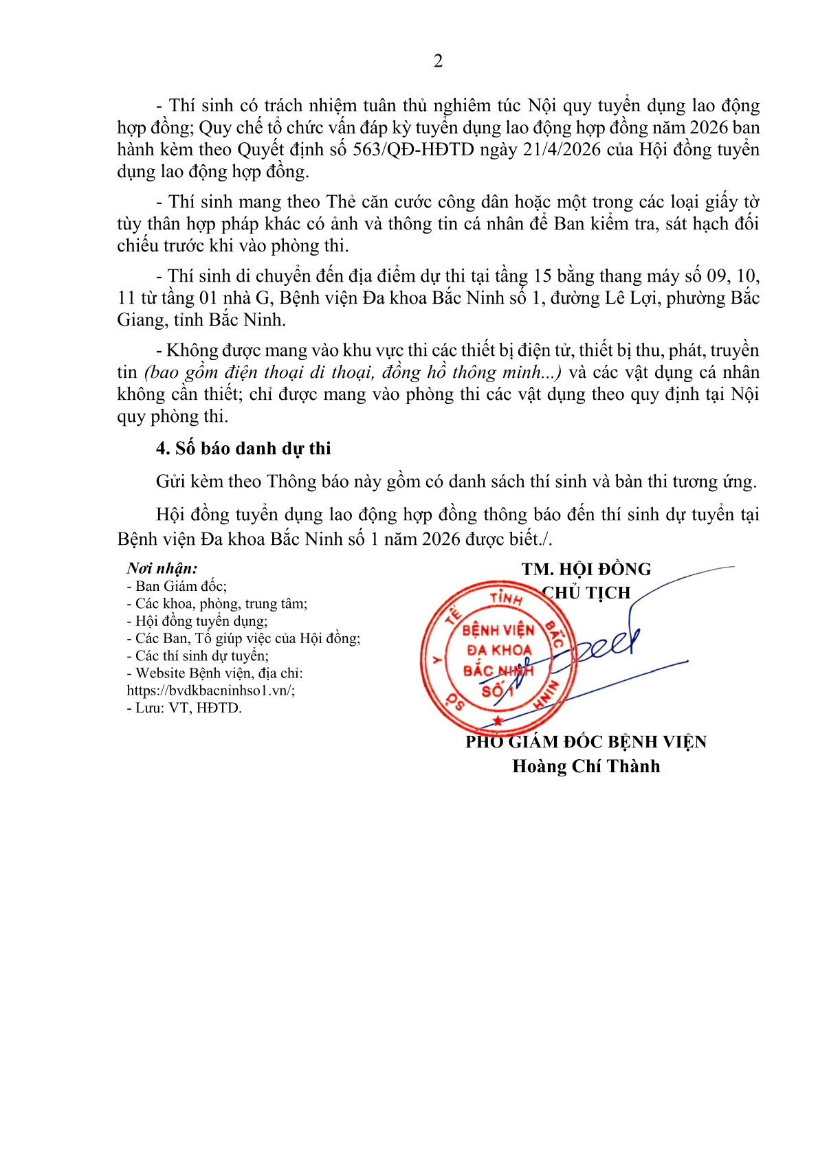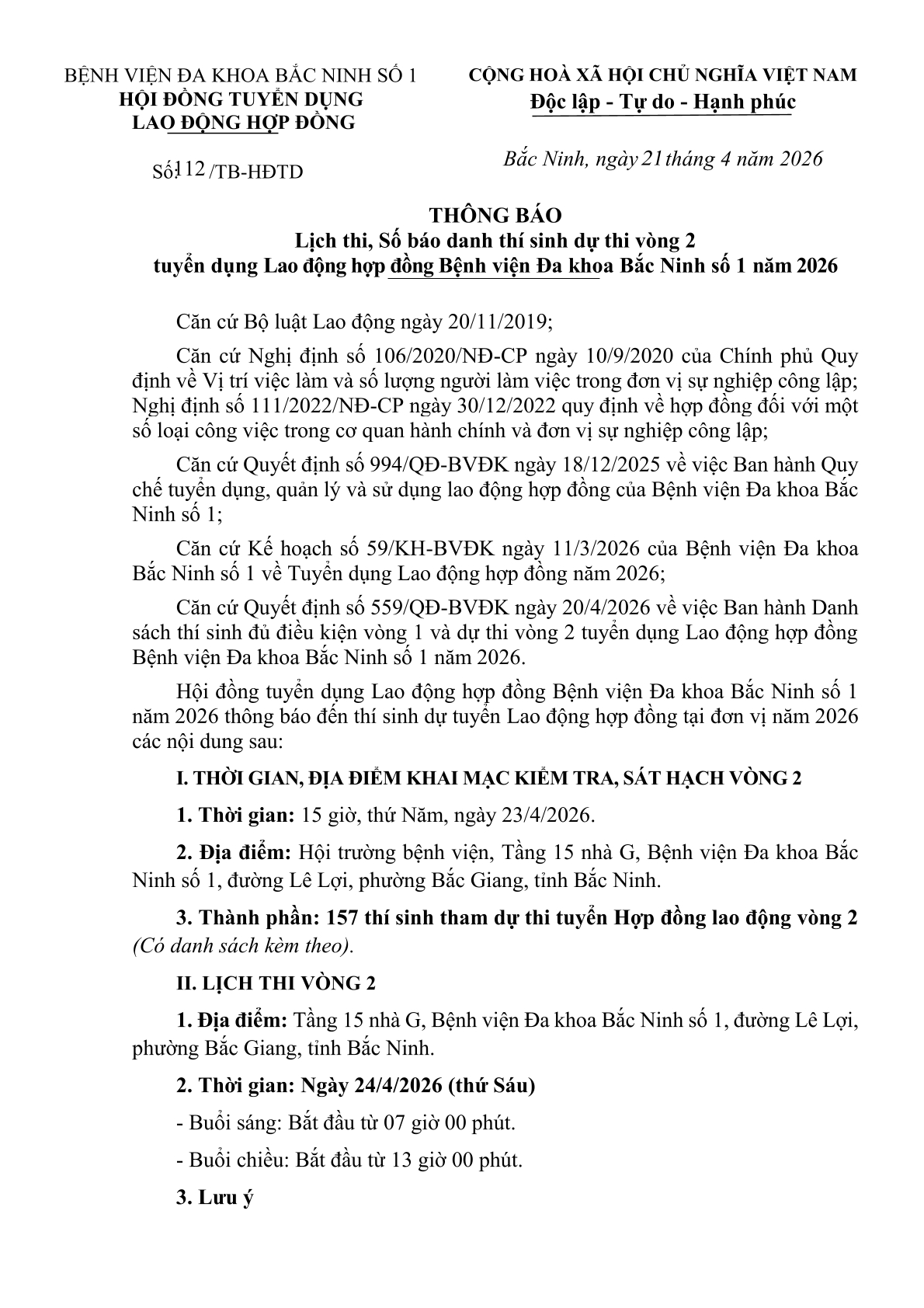 THÔNG BÁO Lịch thi, Số báo danh thí sinh dự thi vòng 2 tuyển dụng Lao động hợp đồng Bệnh viện Đa khoa Bắc Ninh số 1 năm 2026