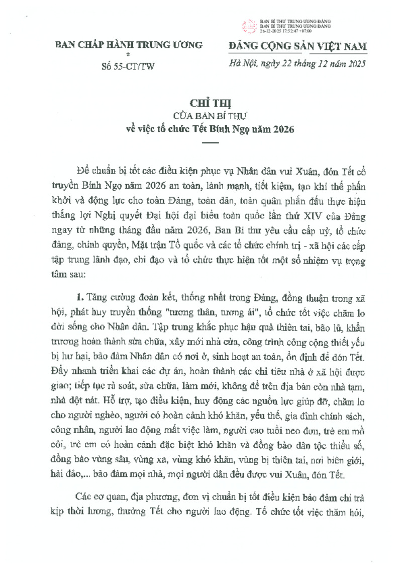 | Tiêu đề văn bản | Chỉ thị số 55-CT/TW ngày 22/12/2025 của Ban Bí thư về việc tổ chức Tết Bính Ngọ năm 2026 | ||