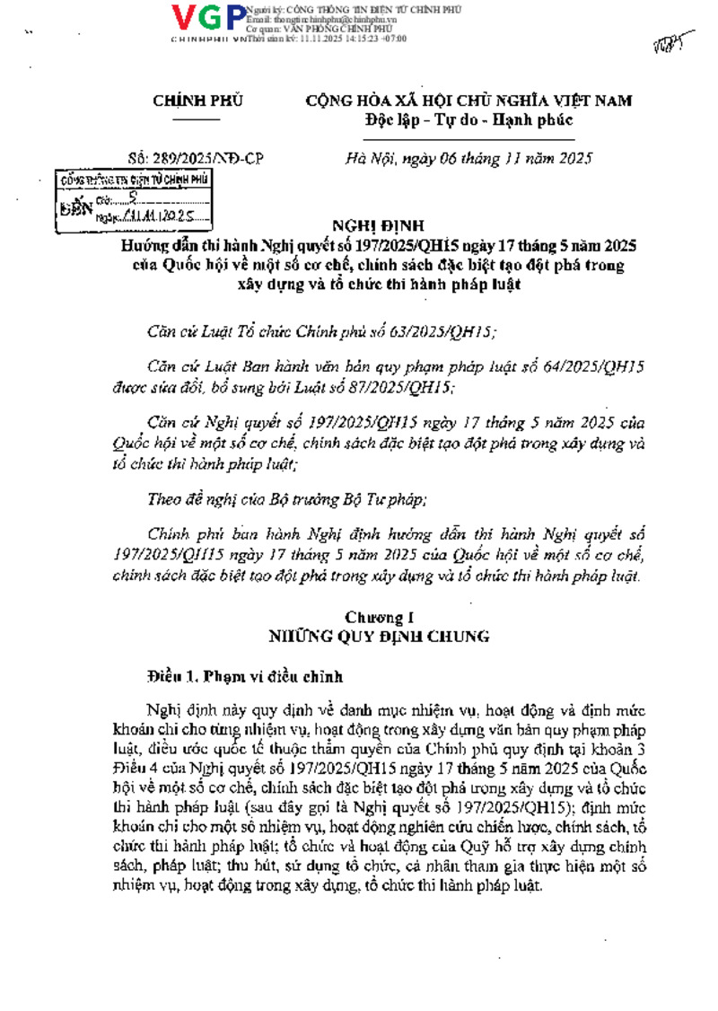 | Tiêu đề văn bản | Nghị định 289/NĐ-CP Hướng dẫn thi hành Nghị quyết số 197/2025/QH15 ngày 17 tháng 5 năm 2025 của Quốc hội về một số cơ chế, chính sách đặc biệt tạo đột phá trong xây dựng và tổ chức thi hành pháp luật | ||